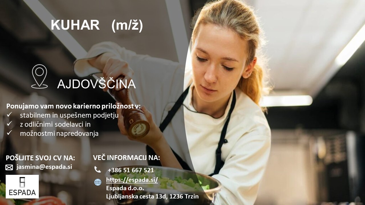 • Ustrezna izobrazba: Kuhar ali gostinski/živilski tehnik